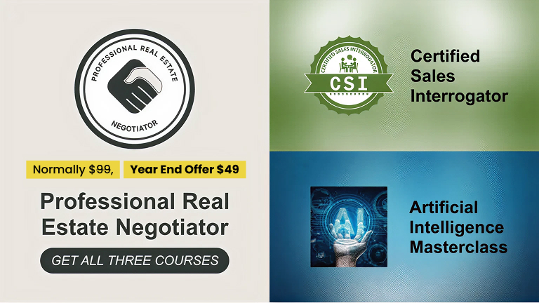 Professional Real Estate Negotiator will take your negotiation skills to the next level. Certified Sales Interrogator will help master what to say to get buyers and sellers to say “Yes”. Artificial Intelligence Masterclass will help transform your prospecting.